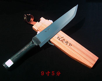 4寸5分の刃先は、他のサイズのナガサとは形状が違います。より鋭利に仕上げており、渓流釣りのお客様に喜ばれており、魚をさばくのに最適です。鉈のような使い方には向いておりません。各サイズの木の柄ナガサ共通の持ち手部分には木目の美しい天然木を使用しております。