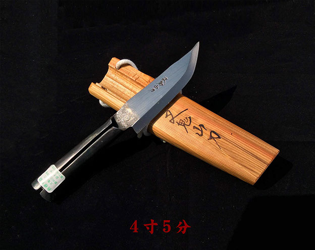 4寸5分の刃先は、他のサイズのナガサとは形状が違います。より鋭利に仕上げており、渓流釣りのお客様に喜ばれており、魚をさばくのに最適です。鉈のような使い方には向いておりません。各サイズの木の柄ナガサ共通の持ち手部分には木目の美しい天然木を使用しております。